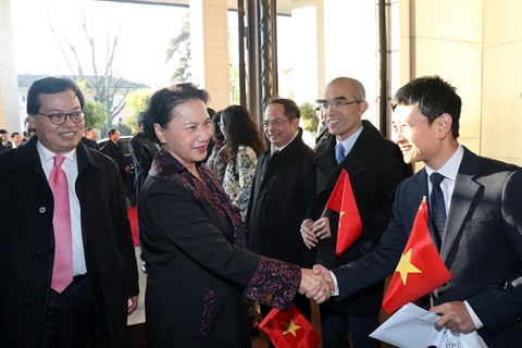| La présidente de l’Assemblée nationale Nguyên Thi Kim Ngân rencontre les fonctionnaires de l'ambassade du Vietnam en Suisse. |