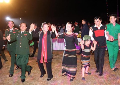 | La présidente de l’Assemblée nationale Nguyên Thi Kim Ngân (3e à gauche) au programme artistique "Printemps dans les villages frontaliers", le 14 janvier à Dak Lak (hauts plateaux du Centre). |