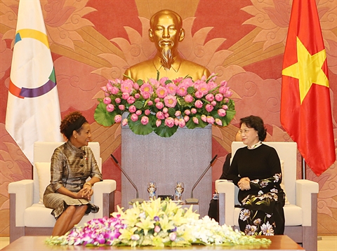 | La présidente de l’Assemblée nationale vietnamienne Nguyên Thi Kim Ngân (droite) et la secrétaire générale de la Francophonie, Michaëlle Jean. |