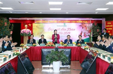 Après avoir adressé ses meilleurs voeux du Nouvel An lunaire au personnel de VCB, la présidente de l’Assemblée nationale a exprimé sa satisfaction devant les réalisations de cette banque en 2018. En effet, l’année dernière, VCB a enregistré le bénéfice avant impôts le plus élevé parmi les banques vietnamiennes, avec près de 18.400 milliards de dôngs (plus de 766 millions de dollars). En outre, son taux de créances douteuses a été ramené à 0,97%. Elle était par ailleurs parmi les premières banques en termes de contributions aux activités sociales.