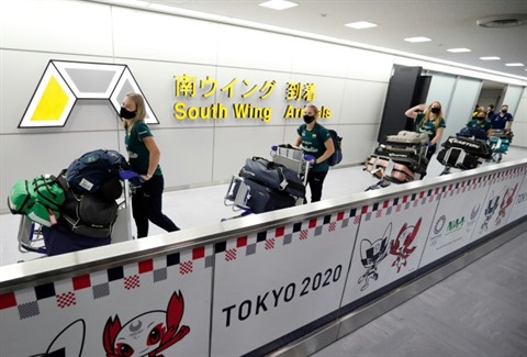 | Les membres de l'équipe olympique australienne de softball arrivent à l'aéroport international de Narita, à l'est de Tokyo, le 1er juin. |