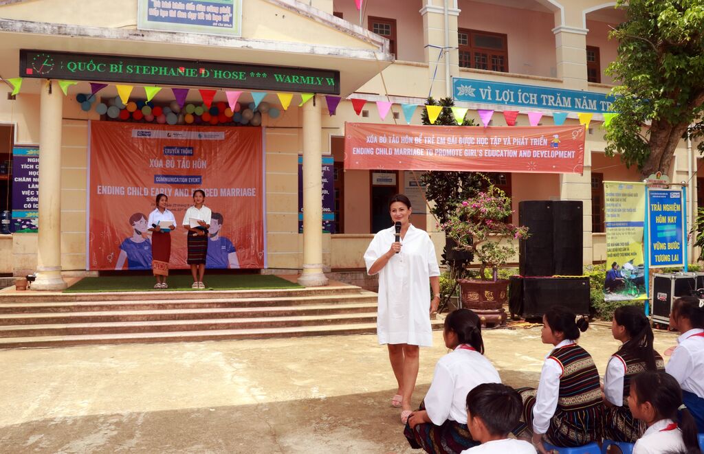 | La présidente du Sénat belge rend visite aux élèves dans une école du district de Huong Hoa. |