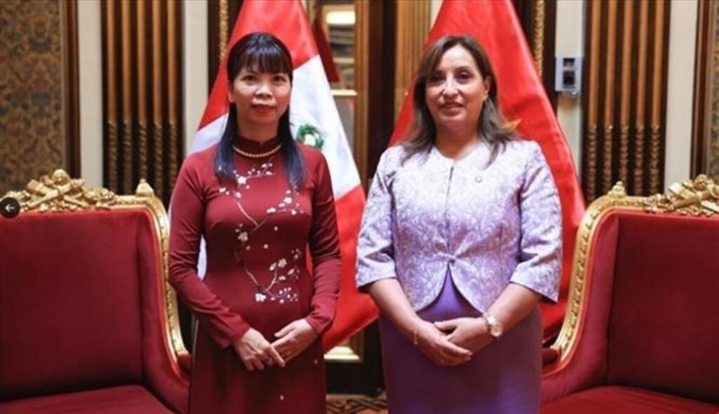 | La présidente péruvienne Dina Boluarte (droite) et l'ambassadrice du Vietnam au Brésil et au Pérou, Pham Thi Kim Hoa. |