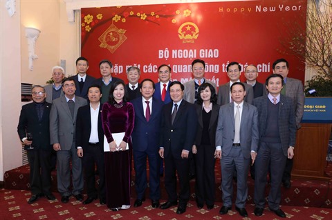 | Le vice-Premier ministre et ministre des Affaires étrangères Pham Binh Minh (1er rang, centre) et des représentants des organes de presse nationaux. |
