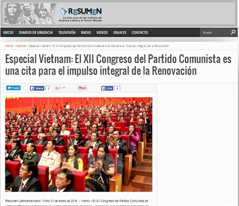 Comprenant quatre articles et des photos sur cet événement politique majeur du Vietnam, le journal argentin Resumen Latinoamericano a indiqué que le XIIe Congrès national du Parti communiste du Vietnam (PCV) était un congrès de solidarité, de démocratie, de discipline et de volonté d'accélérer l’œuvre de Renouveau pour un développement national rapide et durable.