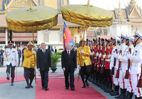 | Le secrétaire général du PCV et président de la République, Nguyên Phu Trong (droite), et le roi cambodgien Norodom Sihamoni passent en revue la garde d'honneur. |