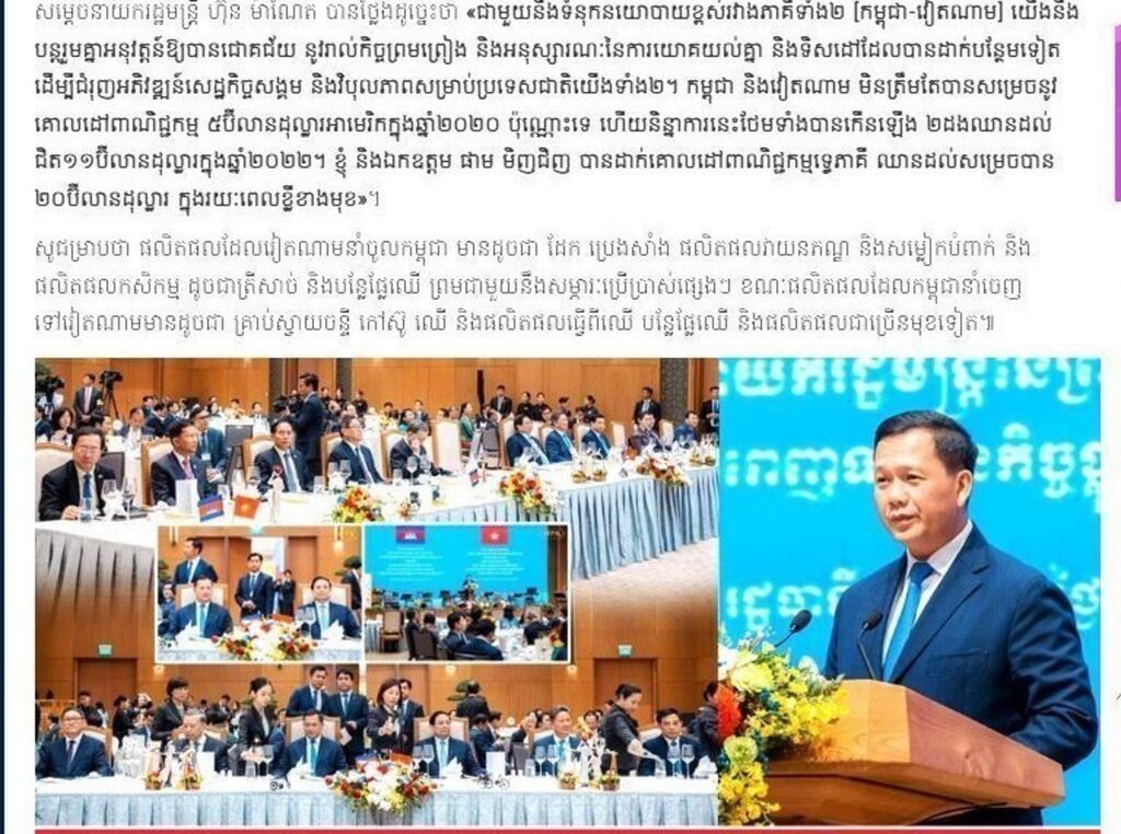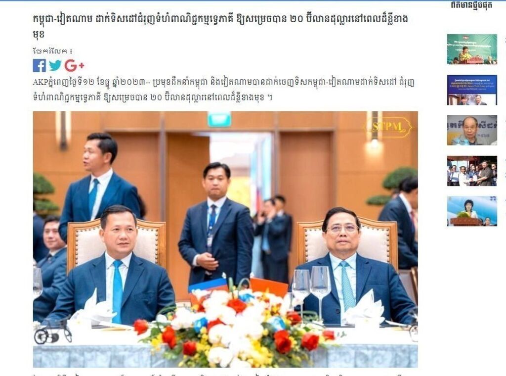 Dans un article intitulé "Le Cambodge et le Vietnam visent 20 milliards d'USD de commerce bilatéral dans un avenir proche", l'Agence Kampuchea Presse (AKP), l'agence de presse officielle cambodgienne, a cité la déclaration du Premier ministre Hun Manet selon laquelle les gouvernements cambodgien et vietnamien s'étaient fixés l'objectif d'atteindre un commerce bilatéral de 5 milliards d'USD en 2020 mais l'avaient plus que doublé avec près de 11 milliards d'USD en 2022.