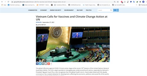 L’article sur le site canadien Geopolitical Monitor (https://Vietnam Calls for Vaccines and Climate Change Action at UN) loue le rôle croissant du Vietnam à l’échelle internationale grâce à ses contributions en tant que membre non permanent du Conseil de sécurité de l’ONU, mandat 2020-2021. Le Vietnam a assumé avec succès la présidence tournante du Conseil de sécurité durant le mois d’avril 2021, une fonction que le pays avait déjà exercée en janvier 2020.