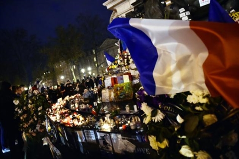 | Fleurs, bougies et drapeau tricolore place de la République le 22 novembre à Paris. |
