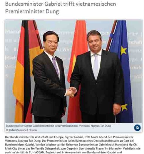 Auparavant, le ministère allemand de l'Économie et de l'Énergie a publié sur son site web des articles et des photos sur la rencontre entre le Premier ministre Nguyên Tân Dung et le vice-Premier ministre et ministre allemand de l'Économie et de l'Énergie, Sigmar Gabriel.
