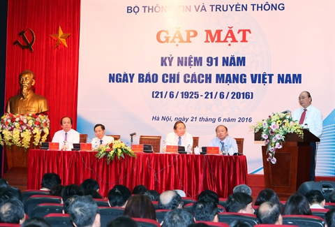| Le Premier ministre Nguyên Xuân Phuc (debout) lors d'une rencontre nationale avec des journalistes, le 21 juin à Hanoi. |