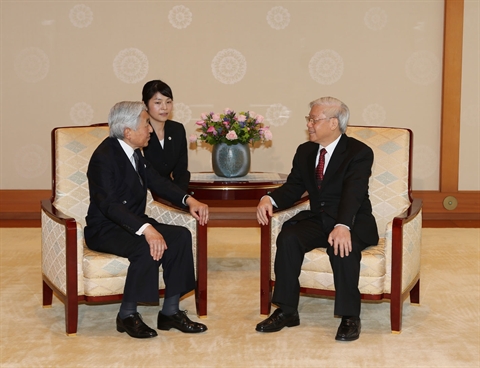 | Le secrétaire général Nguyên Phu Trong (droite) rencontre l'empereur du Japon Akihito le 16 septembre à Tokyo. |