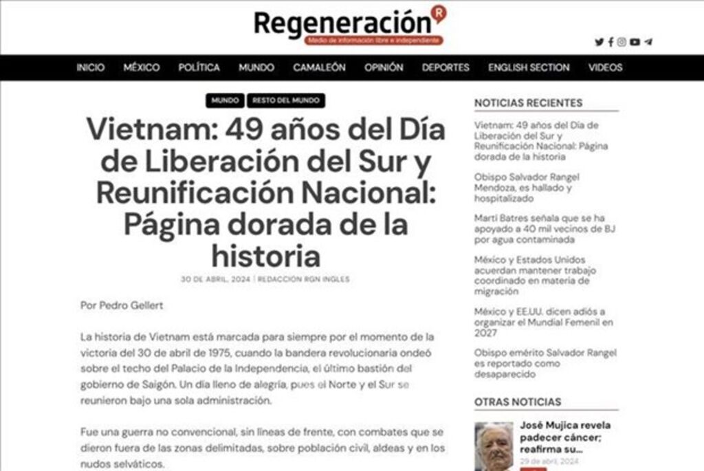 | Le journal électronique mexicain Regeneración publie l'article intitulé Vietnam : 49 ans du Jour de Libération du Sud et de Réunification nationale : page d'or de l'histoire. |