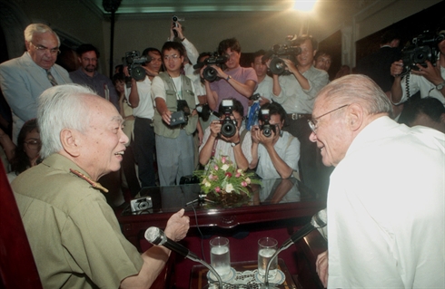 | Le général Giap (gauche) et l'ancien secrétaire à la Défense des États-Unis, Robert Mc Namara, lors d'une rencontre à Hanoi en marge d'un séminaire vietnamo-américain en juin 1997. |