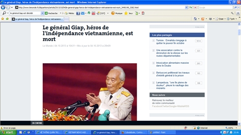 À Rome, la plupart des sites web des grands journaux nationaux ont annoncé vendredi après-midi 4 octobre la nouvelle, louant en tant que héros de l'indépendance nationale du Vietnam. En Allemagne, plusieurs journaux aussi ont publié des articles, regrettant la disparition d'un homme bien-aimé et vénéré au Vietnam comme dans le monde. Ces journaux ont salué sa manière de mener les résistants, ainsi que ses insignes contributions à la lutte pour l'indépendance nationale puis à la protection de la Patrie du peuple vietnamien.