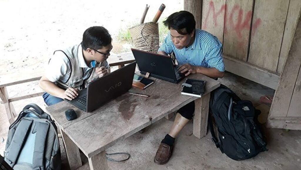 | Des journalistes de l'Agence Vietnamienne d'Information lors d'une mission dans les montagnes du Nord. |