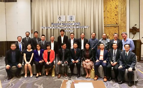 | Des journalistes participant au séminaire régional sur les fausses nouvelles et leur traitement tenu à Bangkok en Thaïlande. |