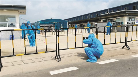 | Des reporters de l'Agence Vietnamienne d'Information travaillent dans l'un des endroits les plus exposés au coronavirus à Bac Giang (Nord). |