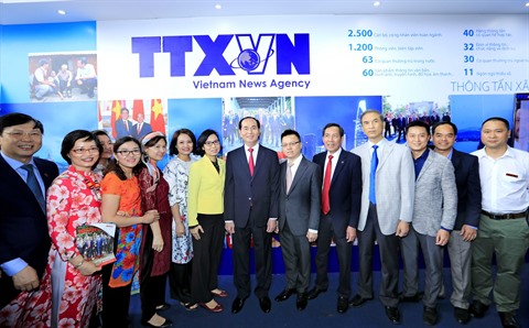 | Le président Trân Dai Quang (centre) tenant le journal Vietnam News de l'Agence vietnamienne d'Information. |