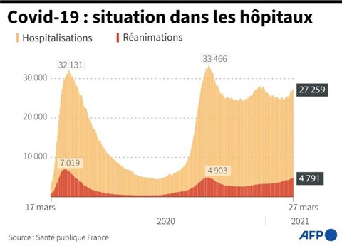 Un conseil de défense doit se tenir mercredi pour décider d'un éventuel durcissement des mesures. L'épidémie a progressé quasiment partout en France en mars, poussée par le variant anglais, jugé plus contagieux et plus virulent. Le nombre de malades en réanimation s'élevait dimanche soir à 4.872, frisant le pic de la deuxième vague à l'automne (4.903). Du côté des hospitalisations, les chiffres sont, là aussi, à la hausse avec 27.712 patients hospitalisés, dont 1.017 nouvelles admissions en 24 heures. Au total, 94.623 personnes sont mortes depuis le début de l'épidémie.