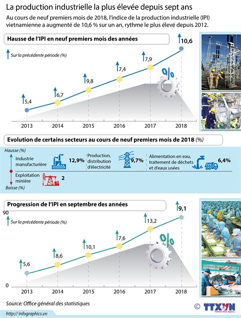 Au cours de neuf premiers mois de 2018, l’indice de la production industrielle (IPI) vietnamienne a augmenté de 10,6 % sur un an, rythme le plus élevé depuis 2012.