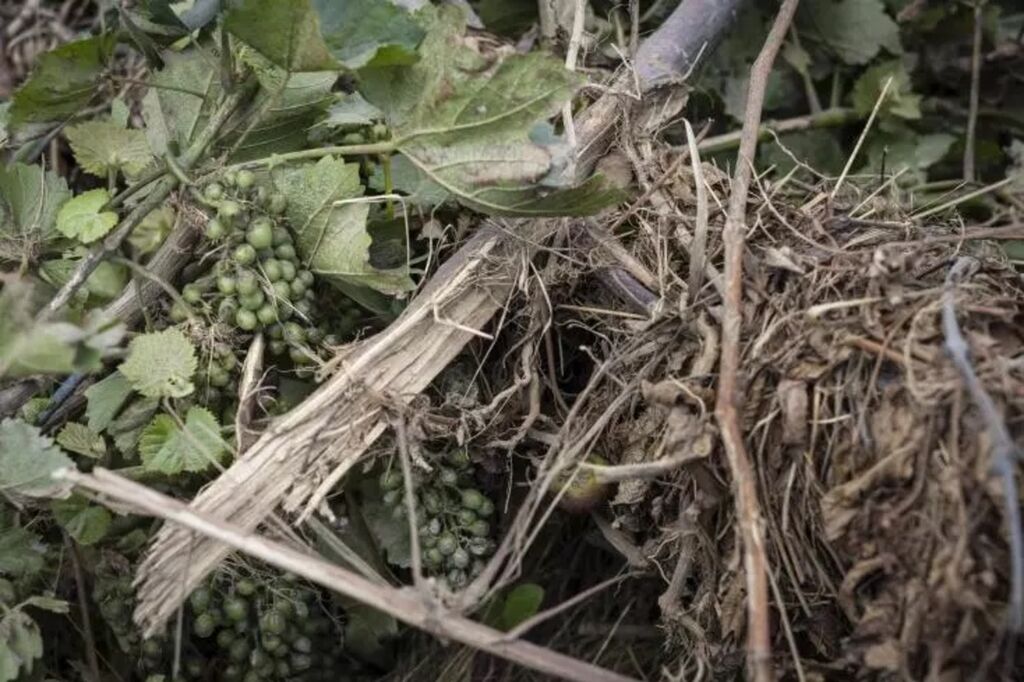| Du raisin dans un vignoble inondé du village viticole de Rech, près de Dernau, en Rhénanie-du-Nord-Westphalie, dans l'Ouest de l'Allemagne, le 30 juillet 2021. |