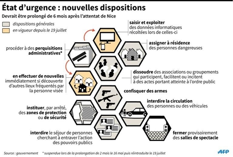 Une prolongation de trois mois avait été décidée par François Hollande quelques heures après l'attaque au camion, revendiquée par l'organisation État islamique, ayant fait 84 morts et 300 blessés le 14 juillet à Nice sur la Promenade des Anglais.