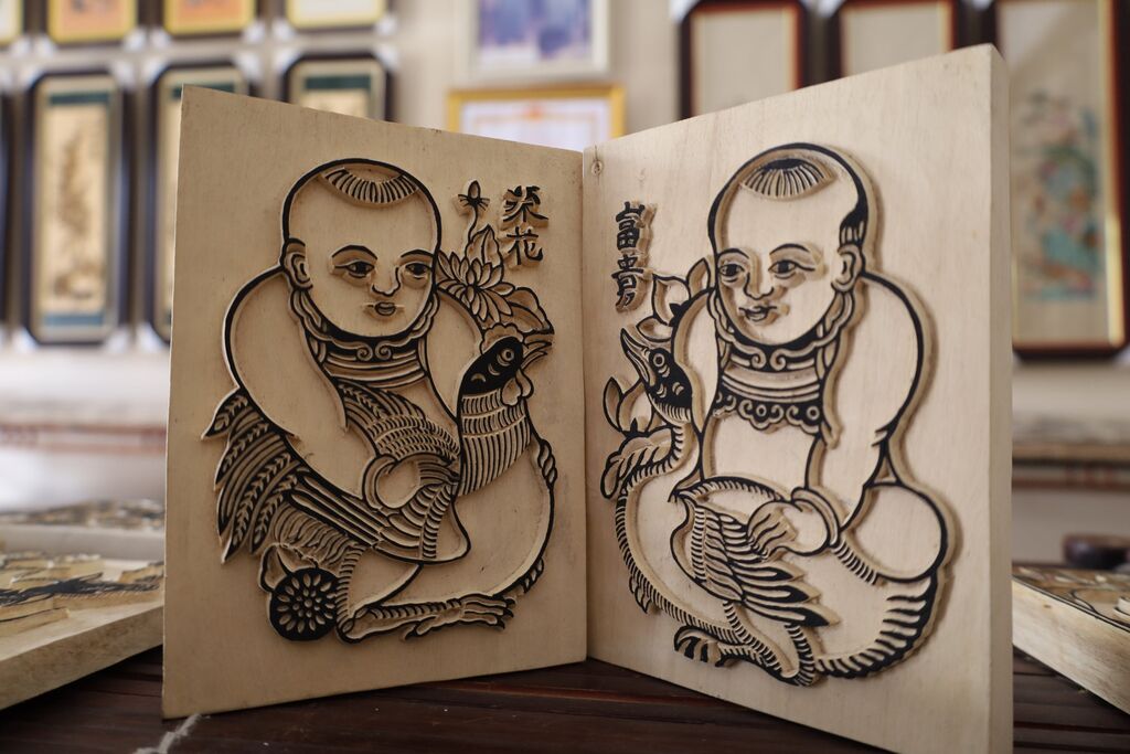 La technique n’est pas simple non plus. Tout d’abord, il faut graver des planches de bois pour constitue des dessins. Ensuite, on imprime la gravure sur la feuille dó. On utilise une plaque pour chaque couleur.