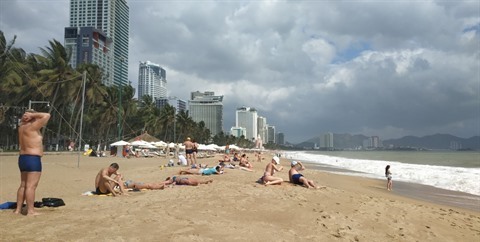 | Des touristes étrangers à la plage de Nha Trang, province de Khanh Hòa (Centre). |
