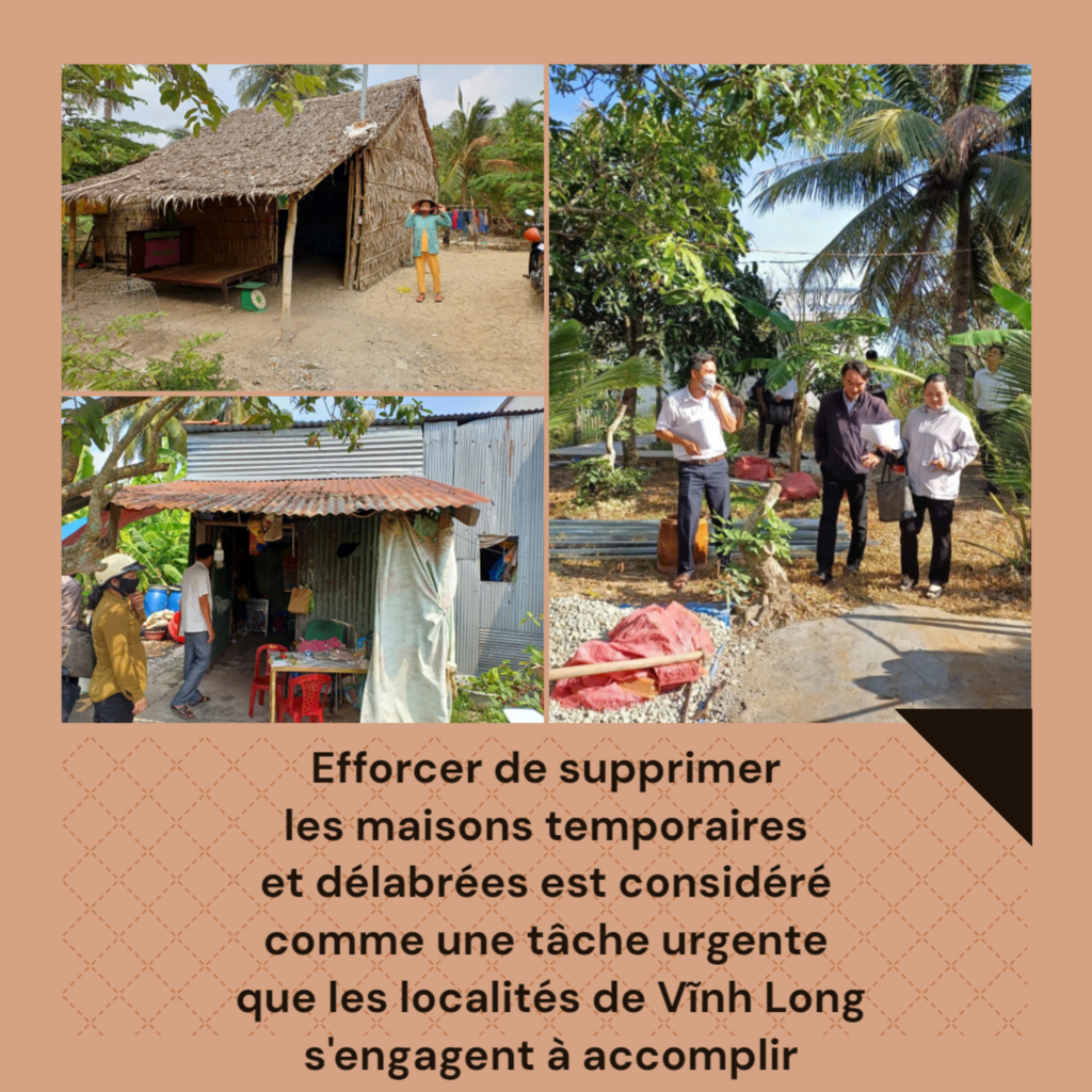 Depuis 2021, la province de Vĩnh Long a construit et rénové 6.933 maisons, dont 2.172 destinées aux personnes ayant contribué à la révolution et 4.761 pour les foyers pauvres et quasi-pauvres. Dans le cadre du plan de suppression des maisons précaires pour la période 2024-2025, la province concentrera son soutien sur les familles appartenant aux catégories suivantes : personnes ayant contribué à la révolution, foyers pauvres, quasi-pauvres et groupes ethniques minoritaires confrontés à des difficultés de logement. Actuellement, les autorités locales procèdent à l’examen et à la compilation des listes des bénéficiaires potentiels. L’objectif est d’achever la suppression des maisons temporaires et délabrées pour ces groupes d’ici la fin du mois d’avril 202