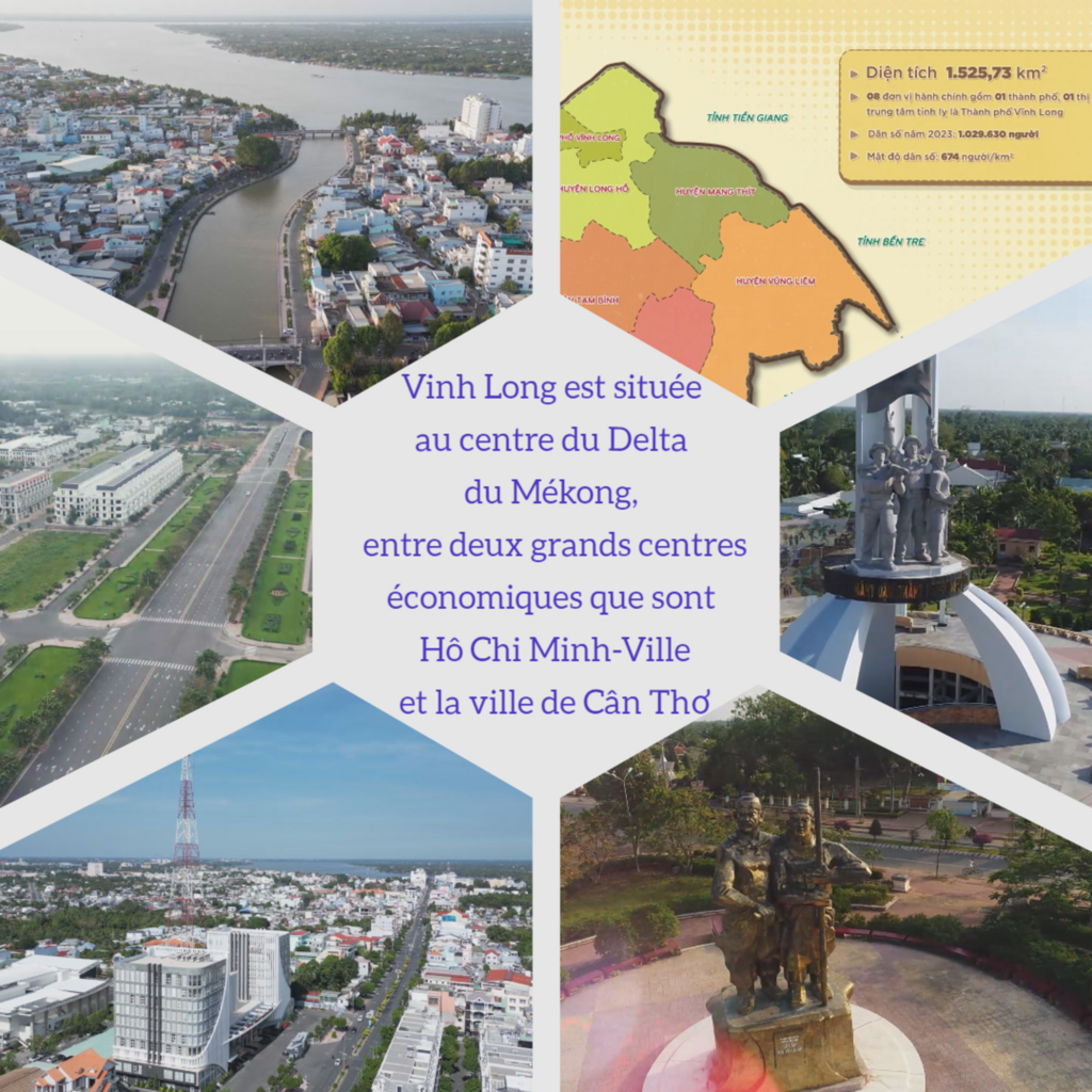 La province de Vinh Long bénéficie d'une position géographique économique avantageuse, située au centre du Delta du Mékong, entre deux grands centres économiques que sont Hô Chi Minh-Ville, à environ 100 km par autoroute, et la ville de Cân Thơ, à environ 30 km au sud. L'accès par route et par voie navigable y est favorable et le système d'autoroutes de la région est en cours de développement.