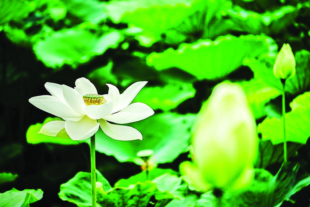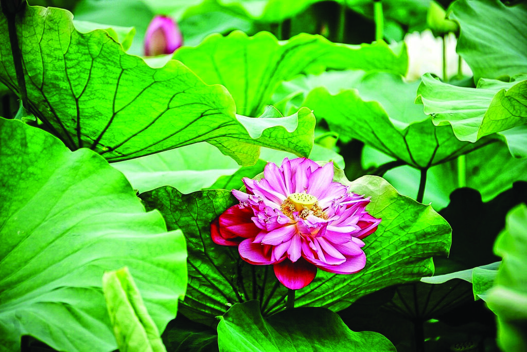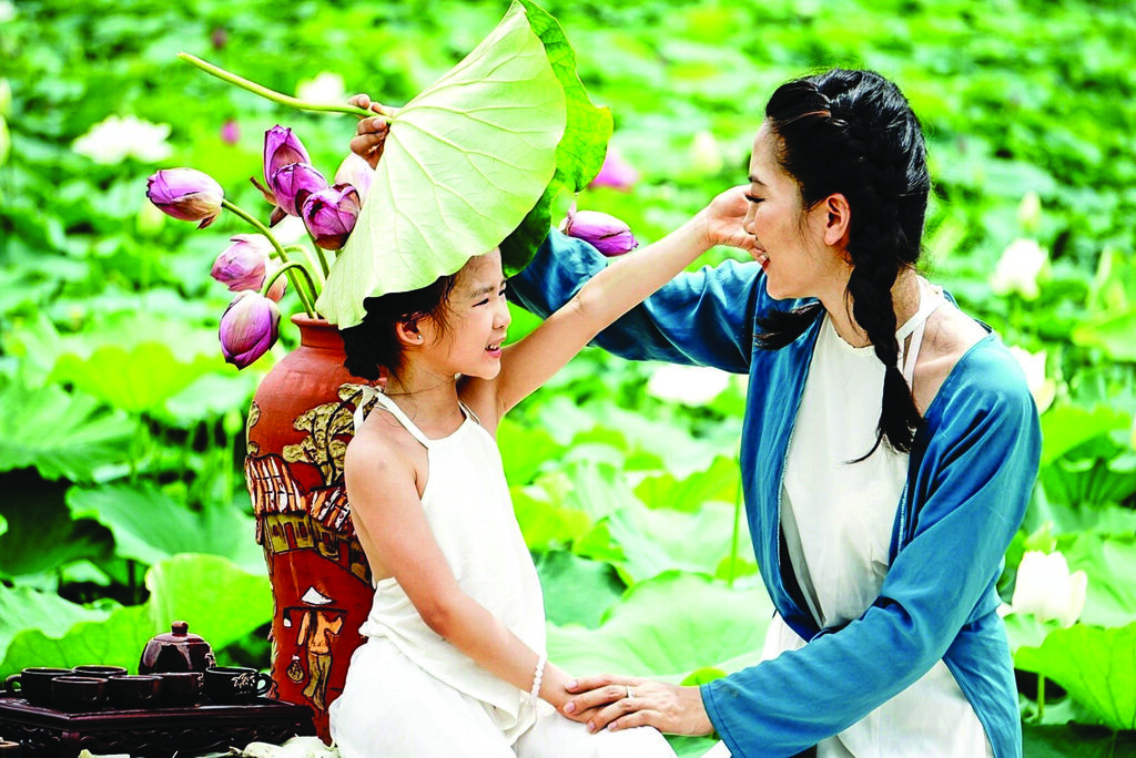 | Un coin du lac de l'Ouest en saison des fleurs de lotus. |