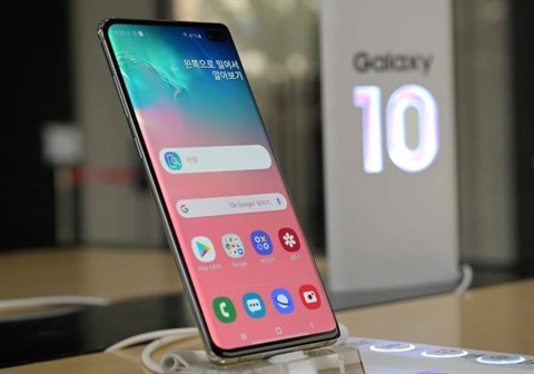 | Le Samsung Galaxy S10+ est exposé dans une boutique de téléphonie à Séoul, le 30 avril. |