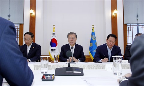 | Le président sud-coréen Moon Jae-in (centre) dans une conférence avec les dirigeants des entreprises, le 10 juillet. |