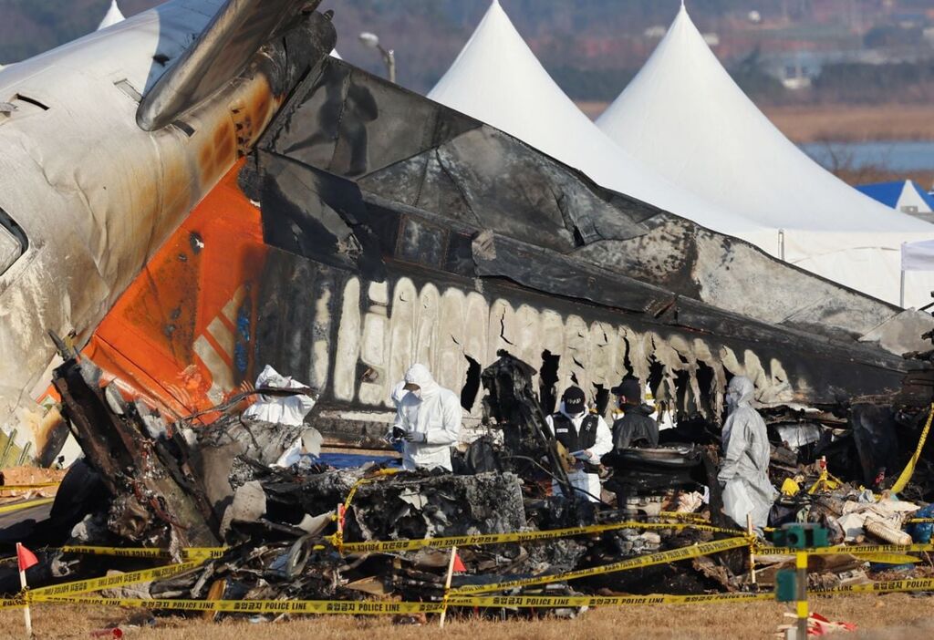 | Des responsables participent à une enquête sur le site où un Boeing 737-800 de Jeju Air s'est écrasé et a pris feu à l'aéroport international de Muan à Muan. |