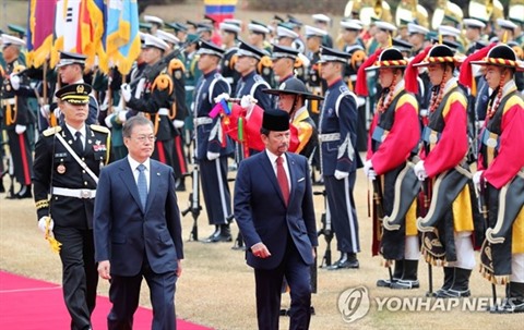 | Le président sud-coréen Moon Jae-in (gauche) et le sultan Hassanal Bolkiah de Brunei lors de la cérémonie d'accueil à Séoul. |