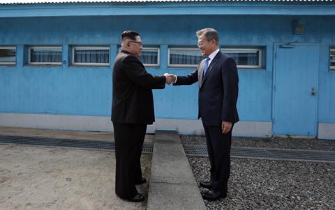 | Le dirigeant de la RPDC Kim Jong Un (gauche) et le président sud-coréen Moon Jae-in, le 27 avril au village frontalier de Panmunjom. |