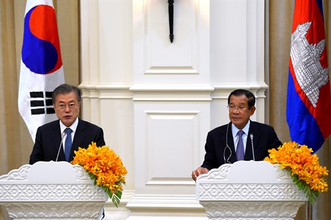 | Le président sud-coréen Moon Jae-in (gauche) et le Premier ministre cambodgien Samdec Techo Hun Sen lors d'une réunion à Phnom Penh, le 15 mars 2019. |