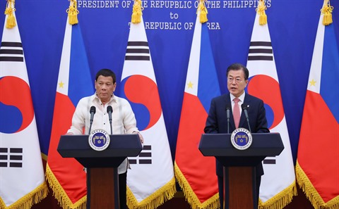 Les deux dirigeants ont salué l'augmentation à un milliard de dollars du Fonds sud-coréen de coopération pour le développement économique (EDCF) pour les Philippines. Ils ont également convenu de stimuler la coopération bilatérale dans les infrastructures, l’énergie et la gestion de l’eau. Le président Duterte est arrivé le 3 juin à Séoul pour une visite officielle de trois jours en République de Corée, dans le but de renforcer les liens bilatéraux dans la défense, la sécurité et l’économie.