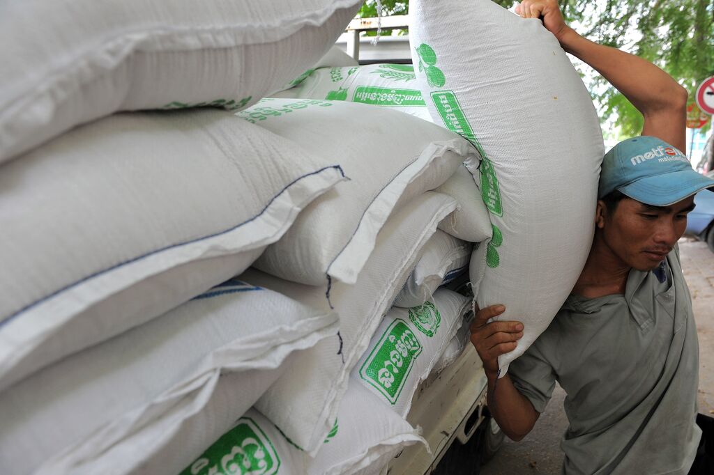 | Transporter du riz à Phnom Penh (Cambodge). |