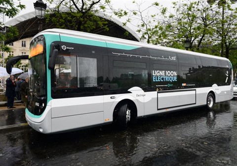 | Un modèle de bus "Bluebus" électrique de la RATP lors du lancement de la gamme à Paris, en mai 2016. |