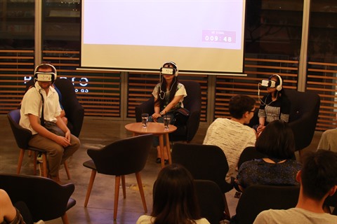 | Les participants au débat, intitulé "La réalité virtuelle", expérimentent la VR, à HCMV. |