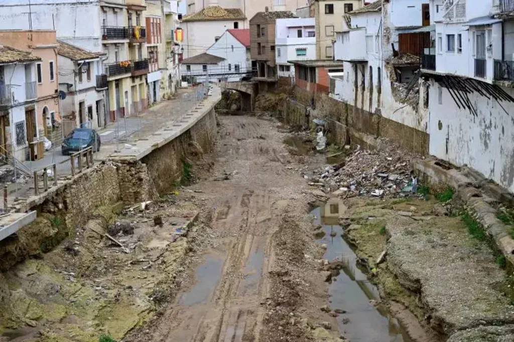 | Des débris bordent la rivière à côté de maisons endommagées à Chiva, dans la région de Valence, le 7 mars 2025, après les inondations dévastatrices d'octobre 2024. |