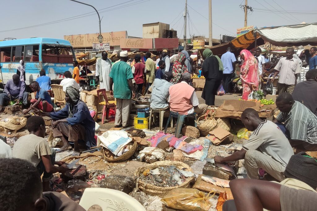 | Des habitants achètent des produits alimentaires dans un marché à Khartoum, au Soudan. |
