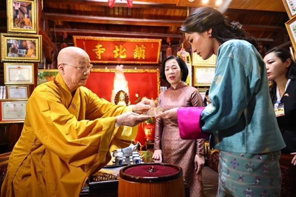 La Reine Jetsun Pema Wangchuck a souligné que, malgré la distance géographique et les différences culturelles entre le Bhoutan et le Vietnam, les deux pays partagent un profond attachement aux valeurs bouddhistes de paix, de sagesse, de compassion et de tolérance. Elle a exprimé l’honneur qu’elle ressentait à visiter cette ancienne pagode et son souhait de voir se développer, à l’avenir, des échanges spirituels, notamment avec les moines vietnamiens au Bhoutan.