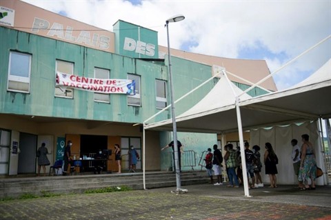 | Des personnes font la queue devant un centre de vaccination contre le COVID-19, le 13 août au Lamentin, en Martinique. |