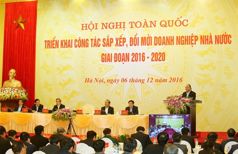 | Le Premier ministre Nguyên Xuân Phuc prend la parole lors d'une conférence nationale sur la restructuration des entreprises publiques, le 6 décembre à Hanoï. |