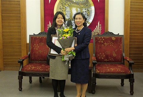 | Ritsu Nacken (gauche), représentante en chef adjointe du Fonds des Nations Unies pour la population au Vietnam, a reçu le 15 février à Hanoï l’Insigne du ministère vietnamien de l’Intérieur. |