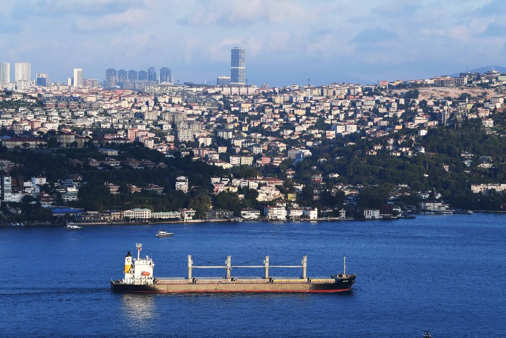 | Un bateau transportant des céréales ukrainiennes traversant le détroit de Bosphorus, en Turquie. |