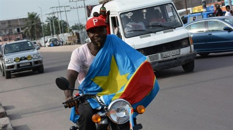 | Un motard congolais enveloppé du drapeau de la RD du Congo dans une rue de Kinshasa, le 4 février 2015. |